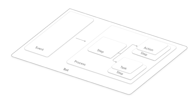 만들어진 봇(Bot) 은 이벤트(Event) 에 의해 프로세스(Process) 를 실행하며, 각 프로세스(Process) 는 여러 개의 단계(Step) 로 이루어져 있습니다. 단계(Step) 는 Task 와 Action 등의 작업을 진행하거나, 작업 진행을 위한 조건을 걸어주는 역할을 하게 됩니다.