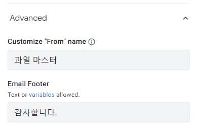 마지막으로 Advanced 버튼을 누르면 메일 발신자명을 바꾸거나 이메일 Footer를 추가해줄 수 있습니다.