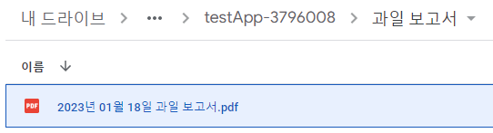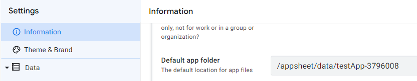 File Folder Path를 통해 앱의 기본 경로로 시작해서 어떤 폴더에 파일을 저장할지 지정할 수 있습니다. 앱의 기본 경로는 설정 > Information > Default app folder에 적혀 있습니다. 저는 File Folder Path 경로를 '/과일 보고서' 라고 했으니, 종합해 보면 파일의 실제 경로는 '내드라이브/appsheet/data/testApp-3796008/과일 보고서'가 될 것입니다.