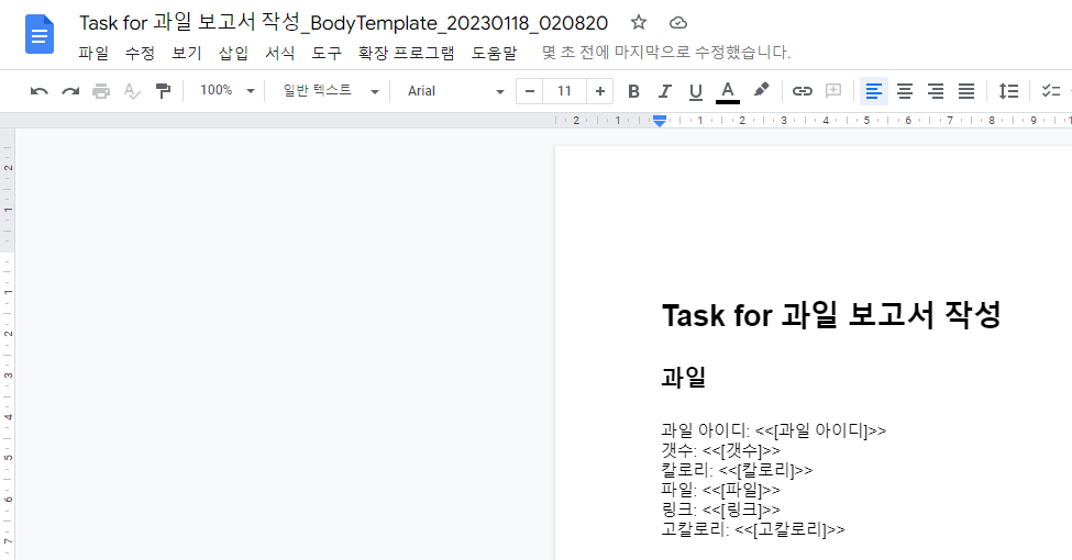 이런 식으로 기본 생성된 파일을 원하는대로 가공하고 수정해 주시면 손쉽게 템플릿 파일을 완성할 수 있습니다. 위 내용에서도 언급했지만, <<겹화살괄호>> 안에 컬럼 이름이나 수식을 넣어주면 각 행의 데이터에 맞게 값이 들어가게 됩니다. 저는 이런 식으로 꾸며 주었습니다.
