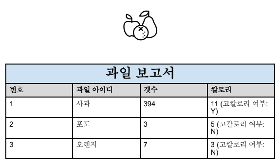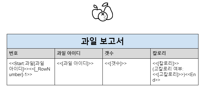 여기서 특이한 점을 하나 발견하셨을 텐데요, 바로 <<Start: 과일[과일 아이디]>>와 <<End>> 부분입니다. 한 개의 행에 대해서 출력하는 템플릿을 만드는 경우에는 이렇게 바꿔줄 필요가 없지만, 여러 개의 행을 한 번에 출력하려면 값들을 <<Start: 테이블명[참조 테이블의 ID]>>와 <<End>>로 묶어주어야 합니다. 이 템플릿으로 문서를 작성하면 아래와 같이 출력됩니다. 원본 테이블도 올려드리오니 값을 잘 비교해 보시기 바랍니다.