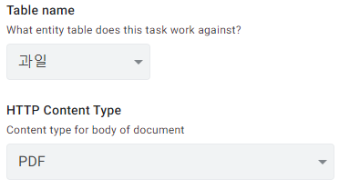 과일 테이블을 선택해준 후, HTTP Content Type을 지정해 줍니다. 파일이 어떤 형식으로 저장될지를 지정하는 것으로, .pdf, .csv, .json 등으로 지정 가능합니다. 보통은 .pdf 파일로 지정해줍니다.