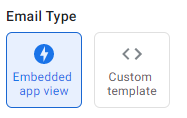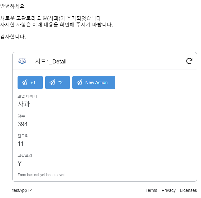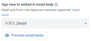 Embedded app view 를 선택하면 템플릿과 함께 메일에 앱시트 화면 중 일부가 표시됩니다. 사용자는 메일 상에서 앱시트 데이터를 변경하거나 Action을 진행할 수 있습니다. 반면에 Custom template은 굳이 앱시트 화면을 메일에 표시하지 않고, 템플릿에 맞는 내용을 자동으로 작성하여 메일을 보내줍니다.