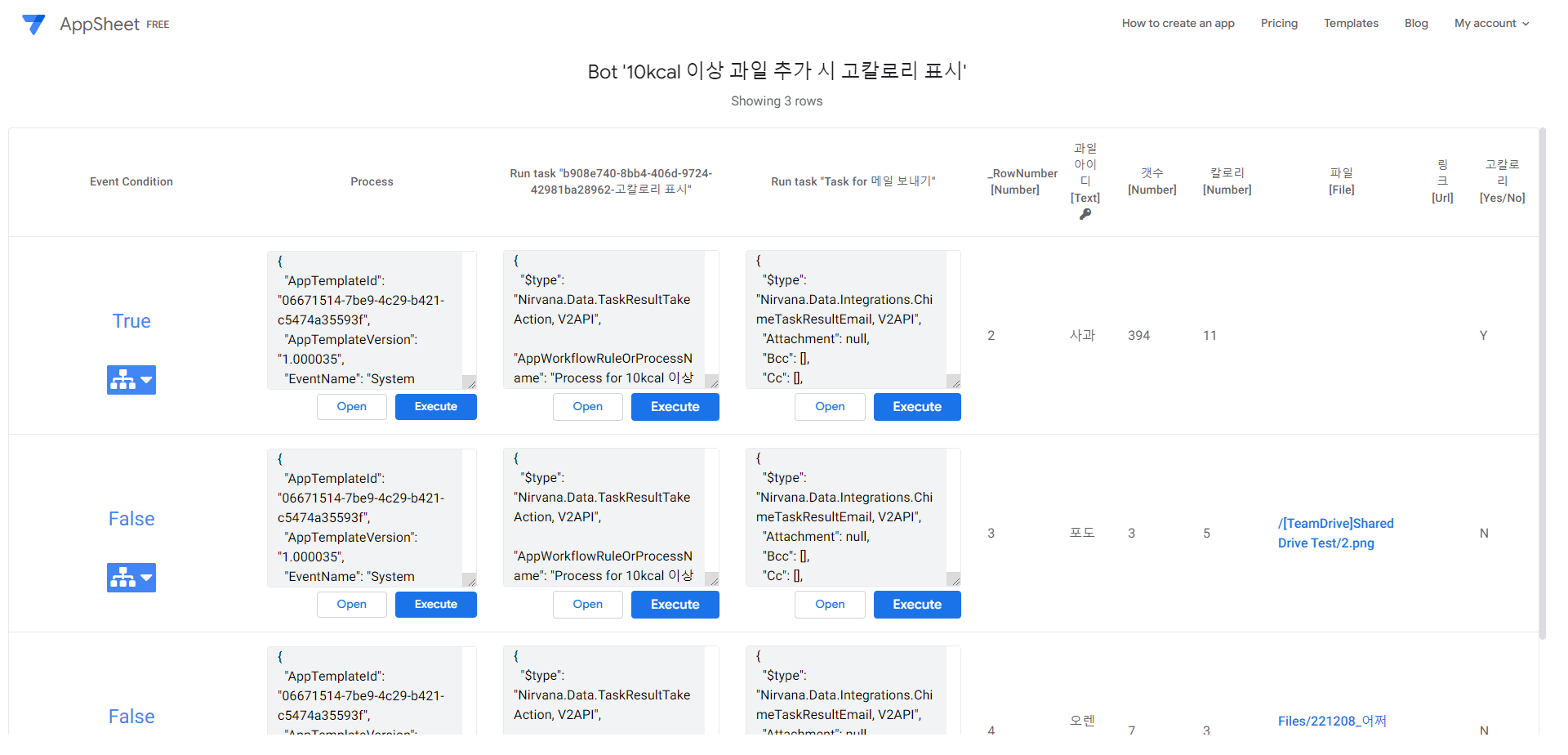 우선 첫번째 열인 Event Condition 은 어떤 행에 의해서 이 Automation이 실행될 것인지를 알려줍니다. 화면에 보이는 것은 '10kcal 이상 과일 추가 시 고칼로리 표시' 봇인데요, 위에서 보셨듯이 제 테이블에서 10kcal이 넘어가는 과일은 사과 뿐이기 때문에 첫번째 행만 True로 표시되고, 나머지 행들은 False로 표시됩니다.