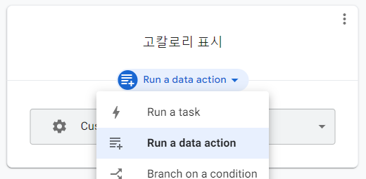 먼저 고칼로리 표시를 위한 단계입니다. 데이터 컬럼 값을 바꾸는 행위는 Run a data action 을 선택해야 합니다.