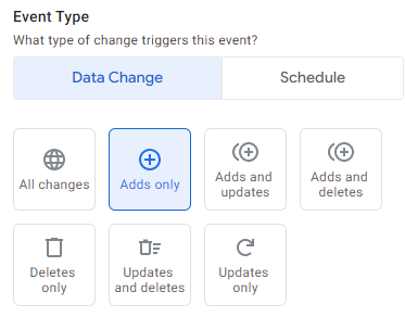 새로운 이벤트를 생성한 뒤 이벤트를 정의해 줍니다. 데이터가 추가됐을 때 Automation 이 실행되도록 하기 위해서는 Data Change 이벤트 중 Adds only를 선택해 줍니다.