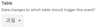 그 다음으로는 Table을 지정해 줍니다. 과일 테이블을 지정하게 되면 다른 테이블이 아닌 과일 테이블에서 발생한 이벤트만 가져오게 됩니다.
