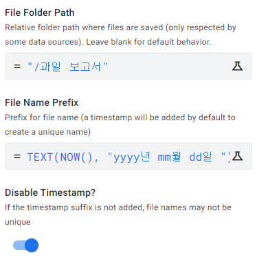 또, File Name Prefix 옵션으로 저장될 파일의 이름을 수식으로 지정할 수 있습니다. 저는 아래 수식으로 작성하였습니다.