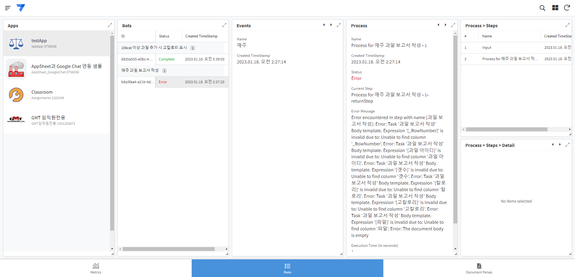 가장 중요한 것은 Bots 부분에 있는 Status 항목입니다. 초록색으로 Complete 라고 표시되었다면 Automation이 정상적으로 실행된 것이고, 빨간색 Error 로 표시되었다면 정상적으로 실행되지 않은 것입니다. 또한, 주황색 Pending 으로 표시된다면 아직 Automation이 실행중인 상태입니다.